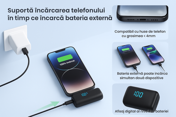Încearcă Bateria Portabilă Super Compactă cu încredere! Oferim o garanție de 30 de zile pentru rambursarea banilor, asigurându-ți o experiență de încărcare fără griji. Bucură-te de o încărcare rapidă și sigură, fără riscuri. Ideală pentru femeile active care doresc să rămână conectate non-stop, fără a-și face griji pentru bateria telefonului lor.